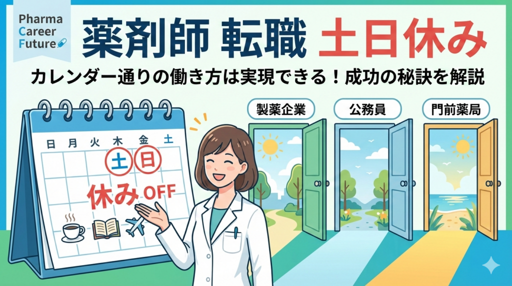 薬剤師が土日休みの職場に転職するには、製薬企業・公務員・門前薬局など「カレンダー通りに休める職場」を狙うのが最短ルートです。本記事では職場別の休日事情から年収の変動、転職成功のコツまでを網羅的に解説します。 【結論】薬剤師でも土日休みの転... -