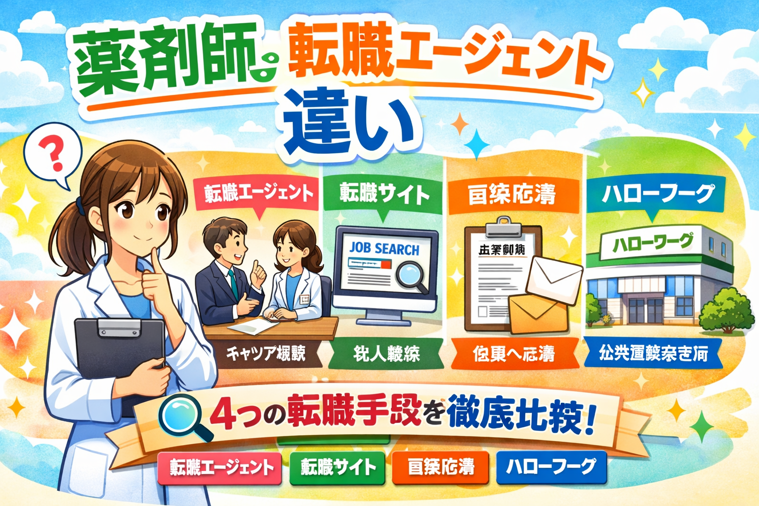 薬剤師の転職を考えたとき、「転職エージェントと転職サイトは何が違うの?」「どのエージェントを選べばいいの?」と迷う方は多いのではないでしょうか。結論から言えば、転職エージェントは専任のキャリアアドバイザーが求人紹介から条件交渉まで一貫してサポートしてくれるサービスで、転職サイトとは利用目的もサポート内容も大きく異なります。本記事では、転職サイト・転職エージェント・直接応募・ハローワークの4つの転職手段の違いを多角的に比較し、薬剤師のあなたが最適な方法を選べるよう徹底解説します。